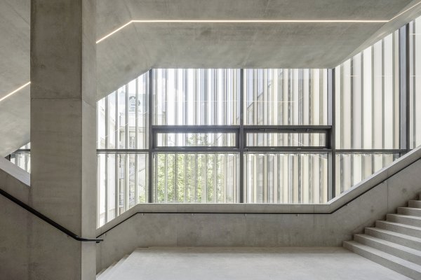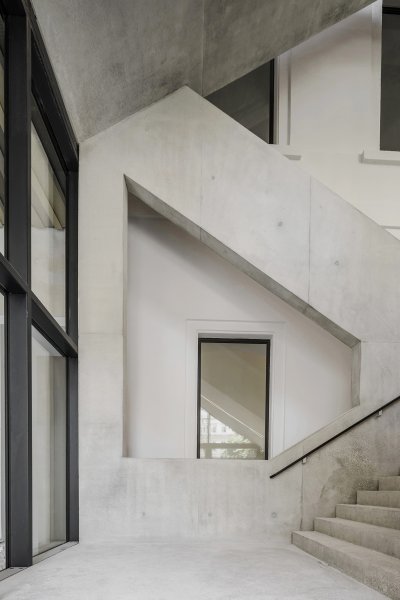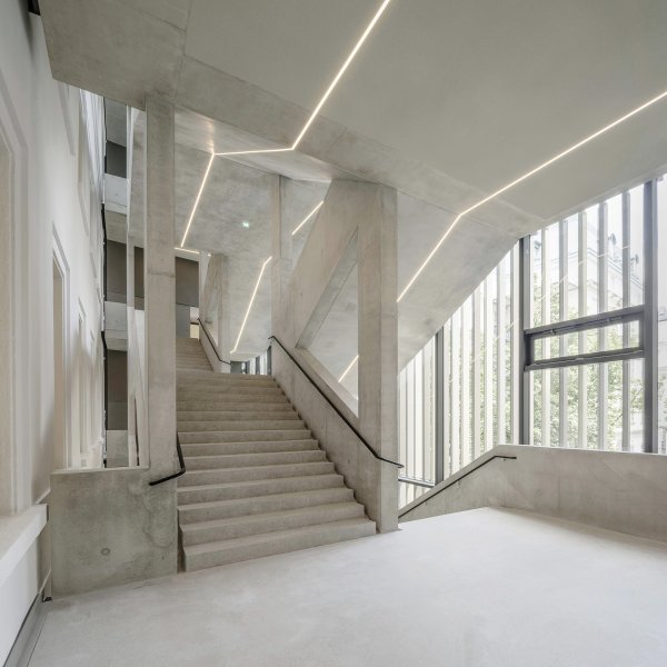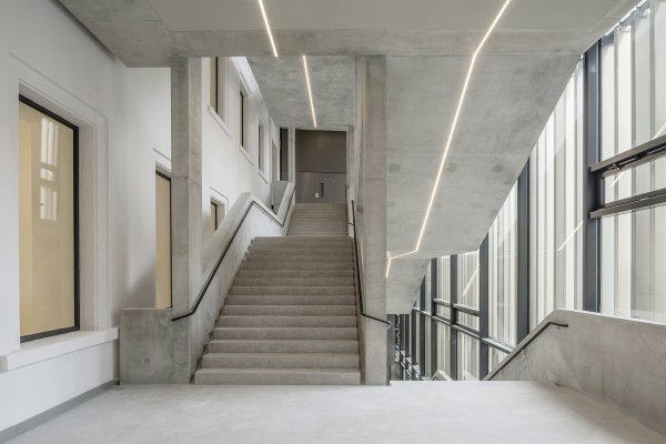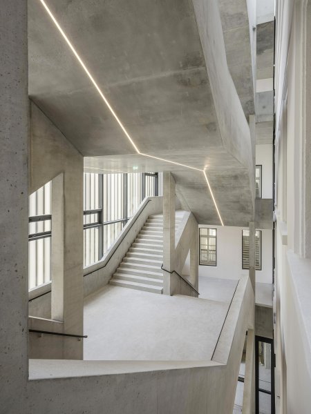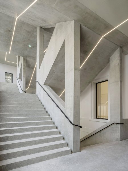 The construction of Staircase 10 is essentially a double scissor staircase connected by a common central landing which acts as a student residence and meeting point. The connection of the two scissor staircases also leads to cascade-like staircase situations and allows the building to be walked on in ever new ways.