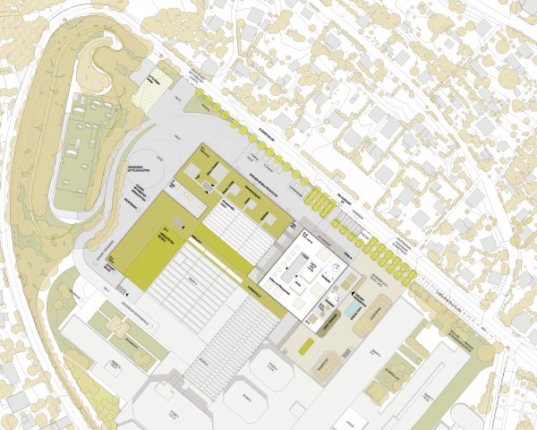 The access situation provides for individually controlled entrances to ensure a separation between internal traffic and VIP/visitor traffic. The compact location of the broadcast van garage, towards Elisabethallee, allows shorter distances and a direct connection to the service areas behind them.