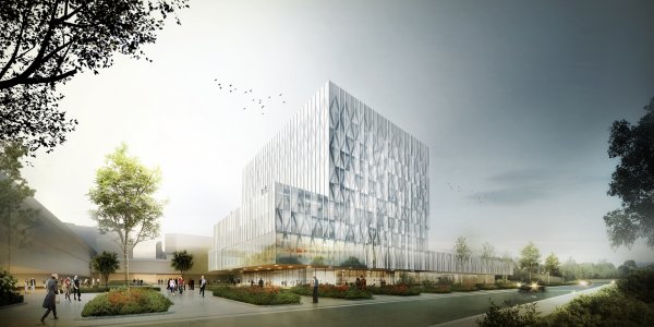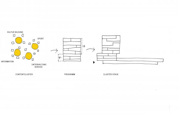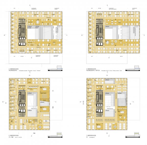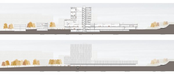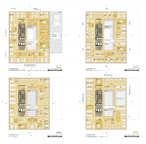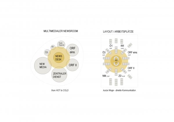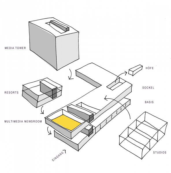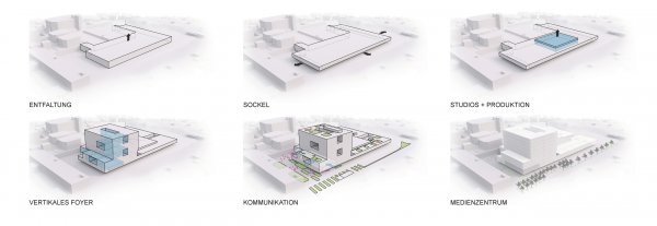 An independent, solitary arrangement of a compact and layered 8-storey structure stands on a 2-storey base plate. At the height of the first floor of the Multimedia newsroom, the 2-storey base plate holds all studios, workshops with adjoining rooms and all storage areas and garages on the ground floor. These form the function framework of the architectural concept