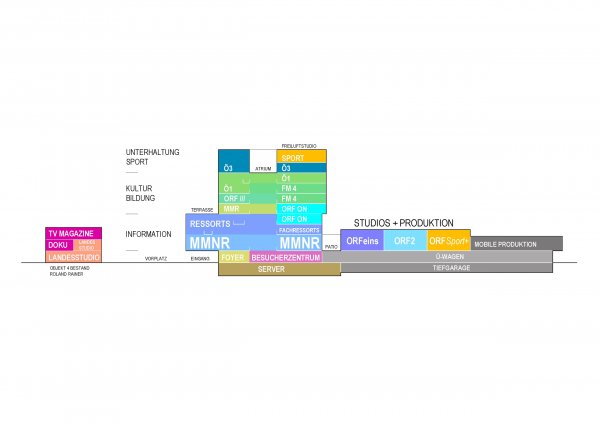 A new forecourt situation will be based on Rainerschen green space concept. It will open up the new visitor centre via Elisabethalee. The interaction of the new building with Rainer’s existing building takes up the reorganisation of the ORF.