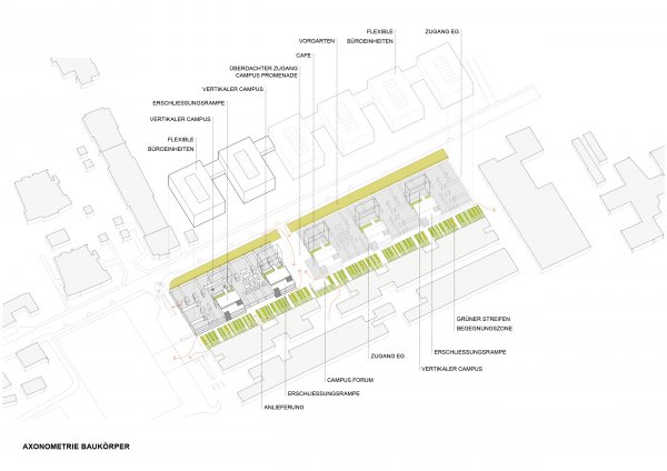 The formulation of the entrances, the promenade and the connected public spaces, define a compact campus structure in the midst of high-quality green spaces and a multi-layered urban integration.