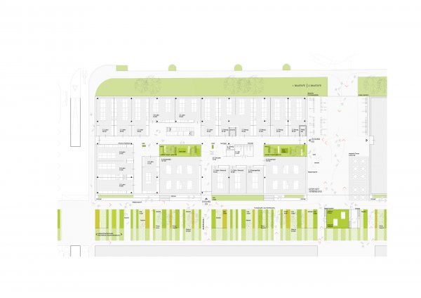 The linear open space, between the existing building and the extension, is designed as a spatially sequenced promenade, which creates both an efficient traffic route and overlapping, attractive and varied outdoor space. A semi-public area, assigned to the SAL Campus, will be created with playable surfaces, meeting points, lounge areas, seating stairs and meadows for lying and sitting. Paved surfaces and lawn stones allow all buildings to be directly supplied with motor vehicles according to the shared space principle.