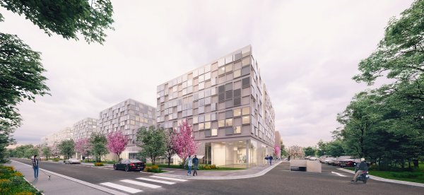 Between the comb-like building components, two patios are being created on the ground floor. From the 1st floor, it looks like sunken gardens: places of peace and relaxation with multi-trunk ornamental trees and a small square in the greenery. Beds, with grasses and perennials, enrich and accentuate these garden areas, while bringing valuable daylight deep into the base.