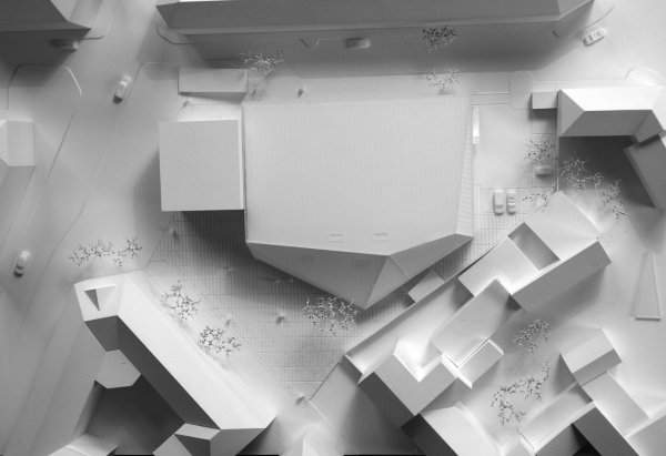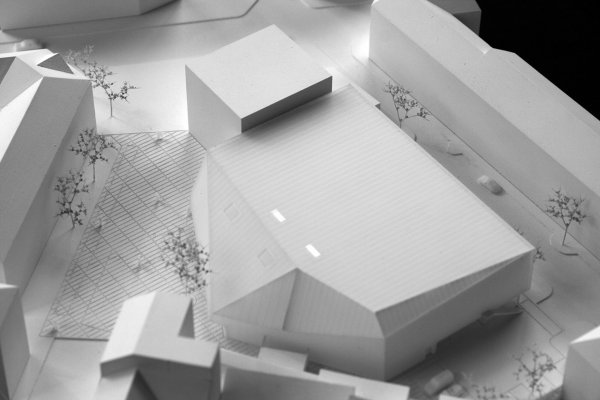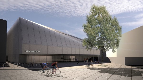 The site for the new sports hall is located in the dense inner-city area of Nuremberg. The surrounding block-edge development will be torn down at the boundary of the site. A mono volume is planned in the resulting gap between the buildings, which will stand out from the rest of the street scene through its material and construction form and will face the existing building of the Hans Sachs Grammar School. The volume of the hall, the adjoining rooms and other requirements such as the number of parking spaces, together with the narrowness and shape of the site, form the shell of the sports hall.