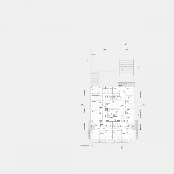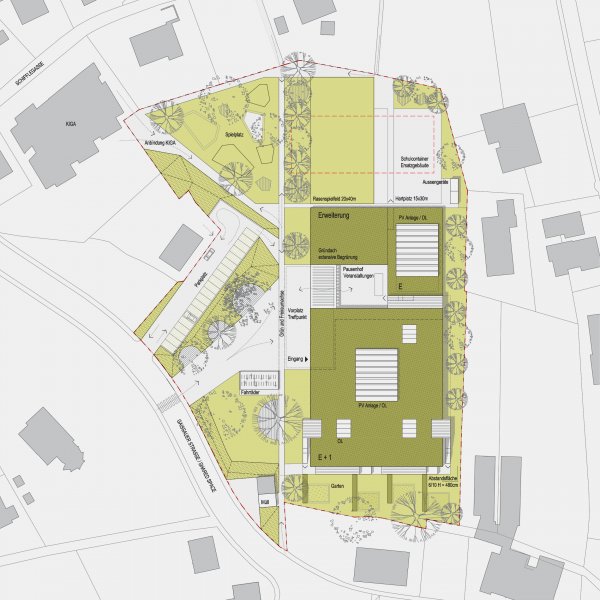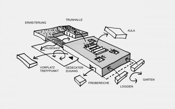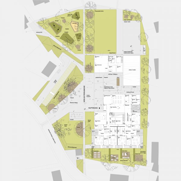 Structuring and setting of the open space by positioning the new building. Creation of new garden situations with ideally usable open space assigned to the school on the ground floor and open spaces directly assigned to the learning units on the upper floor. The positioning of the building structure ensures that all teaching and learning zones receive optimal sunlight.
