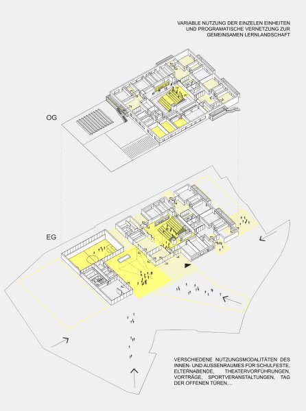 The areas of use are clearly separated on all floors, thus achieving short distances and easy orientation. Multifunctional and flexible use of the common areas and learning rooms as well as partly the assembly hall as: Development and movement rooms, group work and recreation room, learning island for open instruction with the exchange between learning and leisure, rest and relaxation.