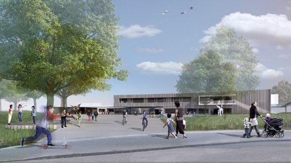 Independent, solitary arrangement of the two-storey, compact school building with optimal implementation of the premises according to the space and function programme. Direct connections to the existing green spaces as well as a direct connection to and from the kindergarten and public access axes are proposed.