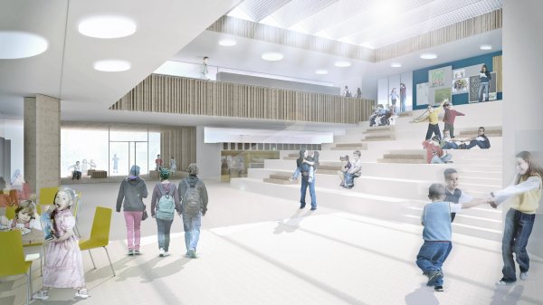 The important multi-functional area is located on the ground floor in order to provide short distances for all students and to offer optimal supervision and access to open-air areas and loggias in the vicinity of the teachers.