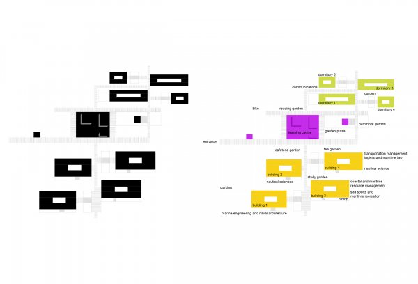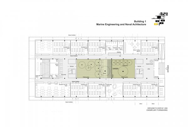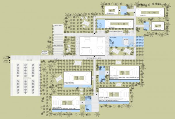 The Ocean University in Kalametiya (Sri Lanka) is a campus of short distances. The clear division and allocation of the buildings on the campus site makes a clear impression, and it leaves open possibilities for expansion and development areas. The campus ensemble is similar to a village structure. In the midst of an orderly structure Campus superordination, learning and leisure zones open up and define communication spaces. Hence, the university as a community of learning, and the university as a village.