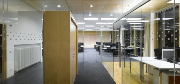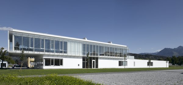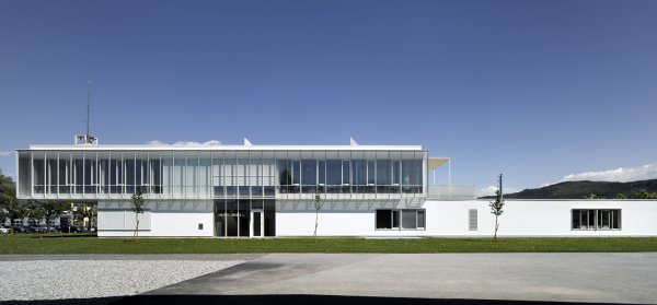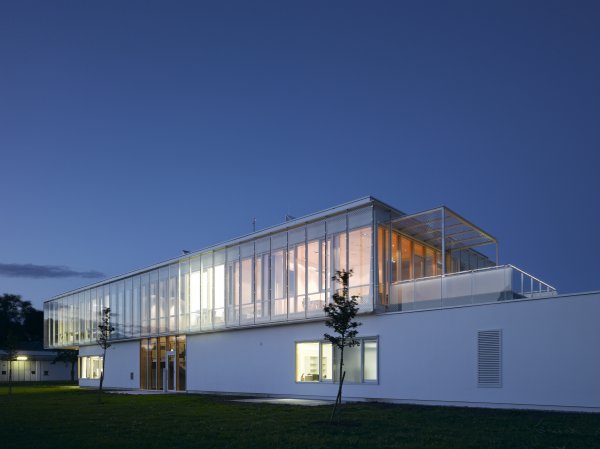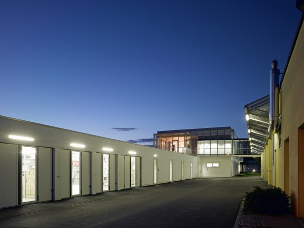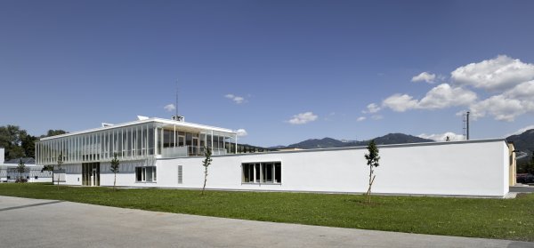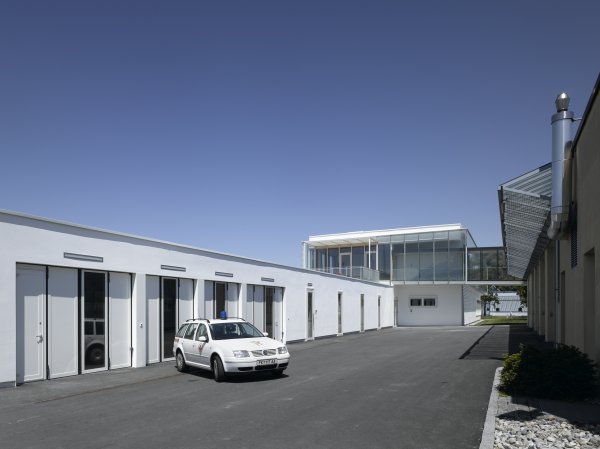 The elongated, partly two-legged structure extends parallel to the existing building of the State Fire Brigade School.