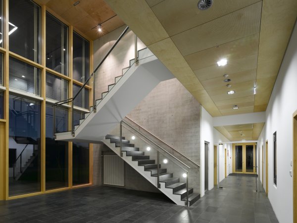 The necessary functions will be arranged along a north-south oriented development axis. The functional area of the control centre is located on a base structure on the 1st floor. The two floors are connected by a staircase, which is located in a two-storey hall open to the west. The strict structural shape of the building is intended to reflect the technical use of the building. The cantilevered part of the control center on the first floor is intended to emphasize the control center and to spatially enclose the large courtyard of the state fire school.