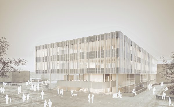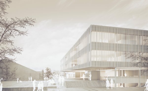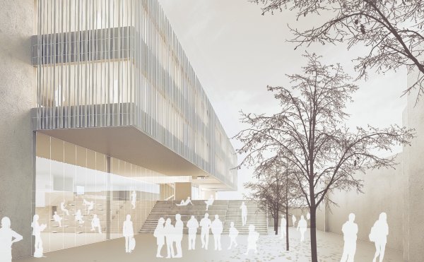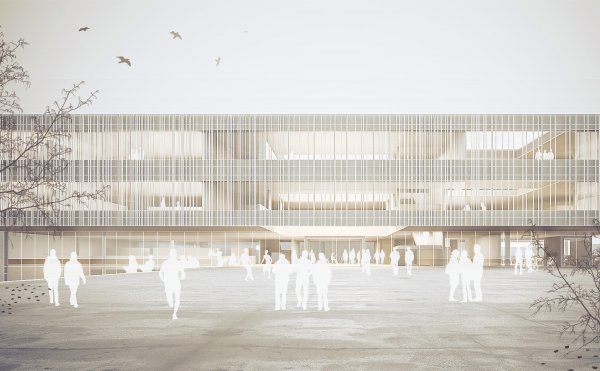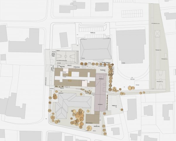 The arrangement of the three- to four-storey building structure of the secondary school with direct access via the existing entrance situation as well as a direct connection to the street space and path network of the surrounding settlement structures, including the formation of an attractive forecourt, which serves as a transition from the public to the semi-public area, are the basis for the implementation.