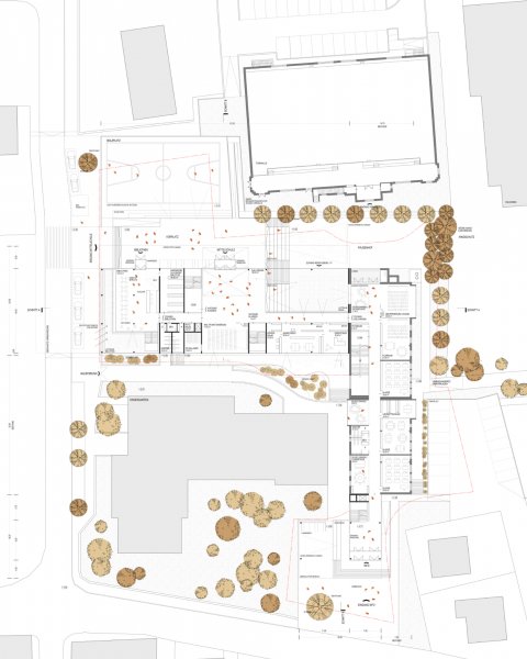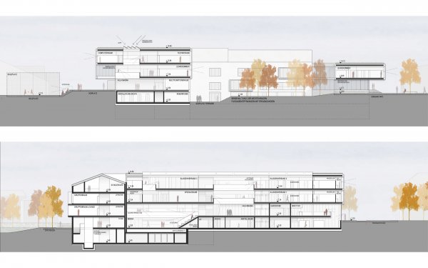 The three- or four-storey building of the secondary school is planned with a separation between the semi-public program on the ground floor/middle floor and the private/school area (class group) on the upper floors.