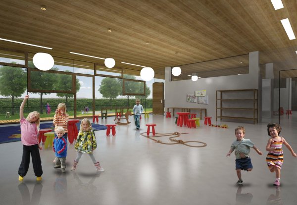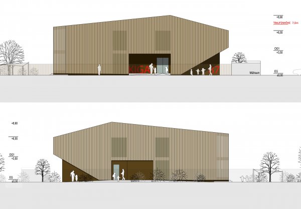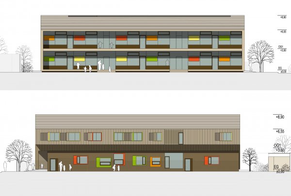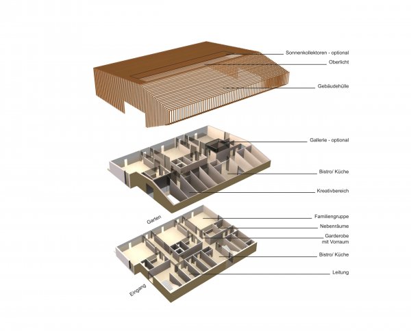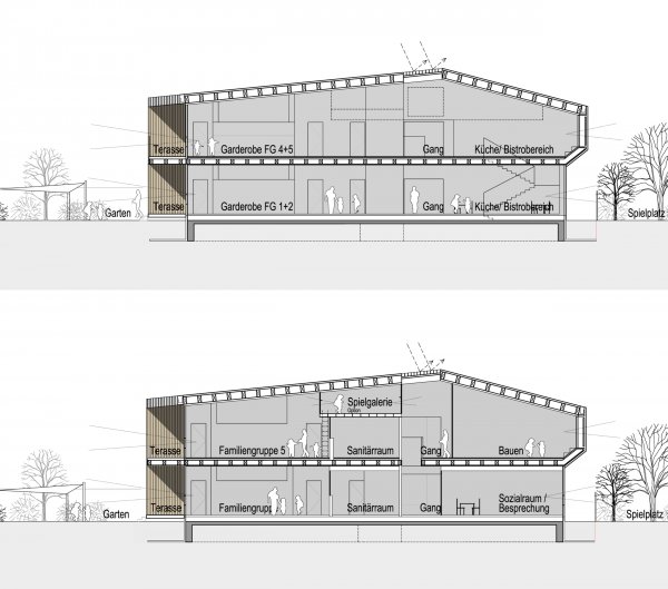 The space allocation plan is optimally implemented in a two-storey building. Each floor contains three group rooms including adjoining rooms. Management is located on the ground floor, creative area on the upper floor directly on the central axis. All group rooms have access to the covered terraces in front of the building and direct access to the open spaces. Kitchen and bistro form a central zone of being together and extend the interior space. Exciting visual connections in all directions as an open dialogue between inside and outside, ground floor and upper floor.