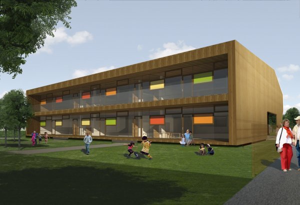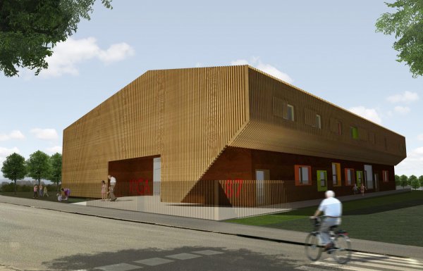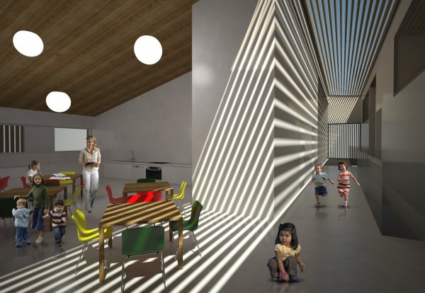 The building structure of the kindergarten is characterised by its compact and distinctive form, which blends into the predominantly heterogeneous surroundings, and thus forms a new urbanistic symbol.