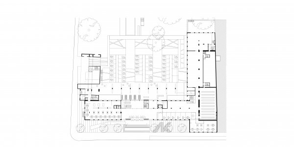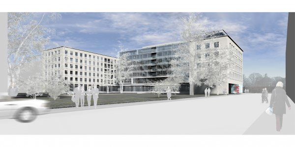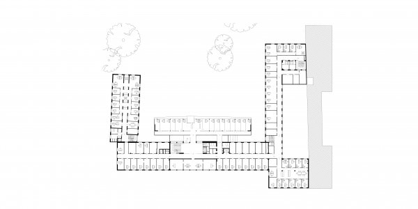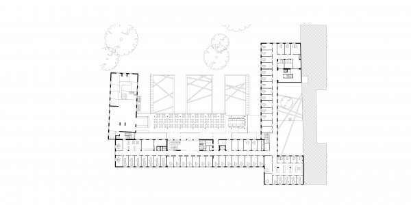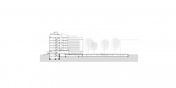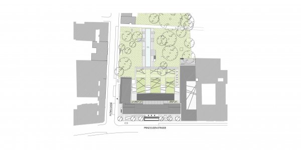 The green area, to the west of the existing building with the existing trees, have been cleared of any above-ground development, and they are available to the employees of the Chamber of Labour as an open-air area.