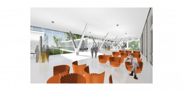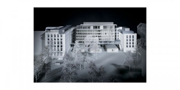 The new six-storey office building, the so-called “Rucksack”, rises above the new advisory centre. It stands parallel to the existing main building. It is connected to the existing building by a three meter wide vertical foyer, that functions as a transparent spatial structure. Through the void of the circulation zone, one can overlook the visitor traffic on all floors.