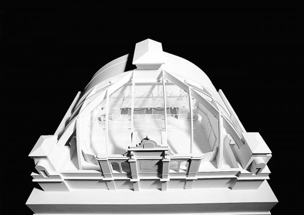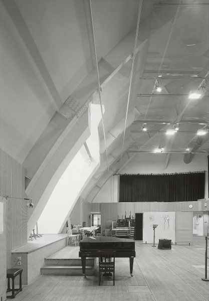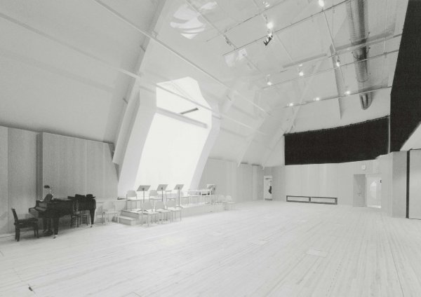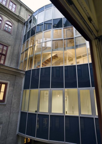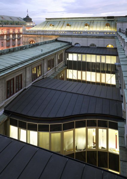 Since 1991, extensive renovation work has been taking place at the Vienna State Opera. The short period of closure for the renewal of the stage hydraulics has also been used to erect a rehearsal stage in the area of the hipped roof. Due to the difficult conditions at the construction site, the transport possibilities in particular had to be taken into account in the planning. For example, it was not possible to use larger steel beams. It was necessary to create a connection from the stage house so that the artists did not have to walk through the audience areas for rehearsals. To increase the playable area, a wall opening was made in a load-bearing wall. The corner towers visible from the side of the Ringstrasse have been used for break purposes, where natural ventilation is provided by the existing windows.