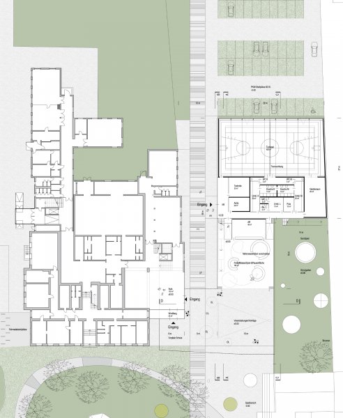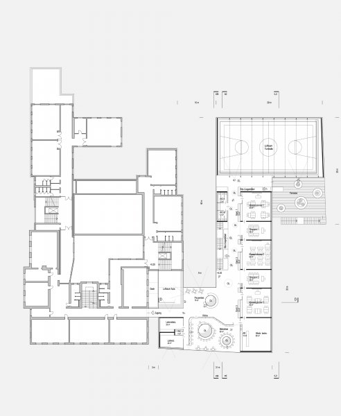 The intern organisation is characterised by short distances and clear connections. A floating transition between intern / external spaces and in between rooms enables a flexible use in running the school.