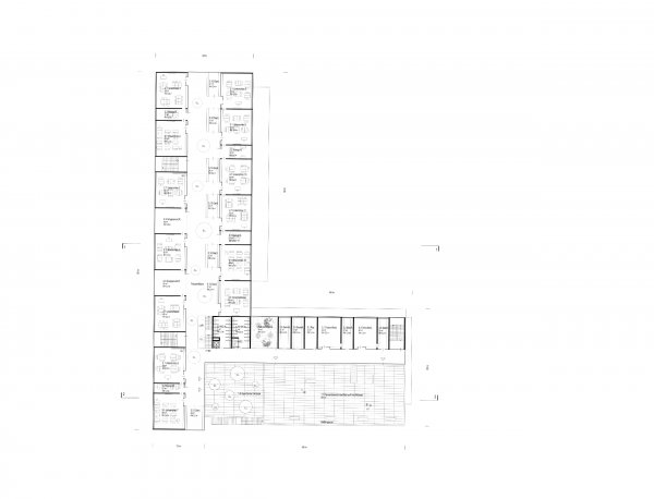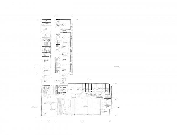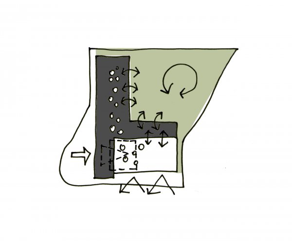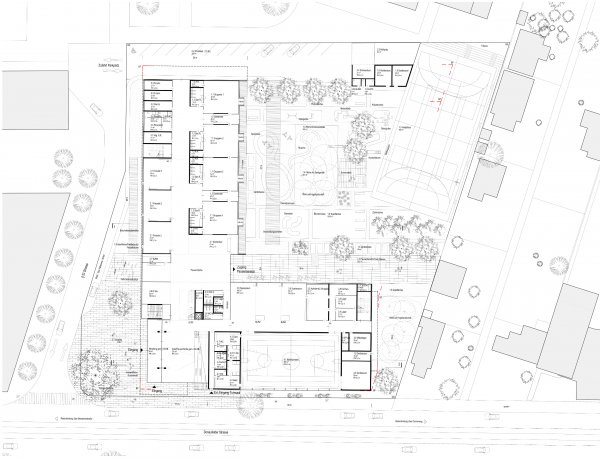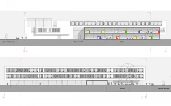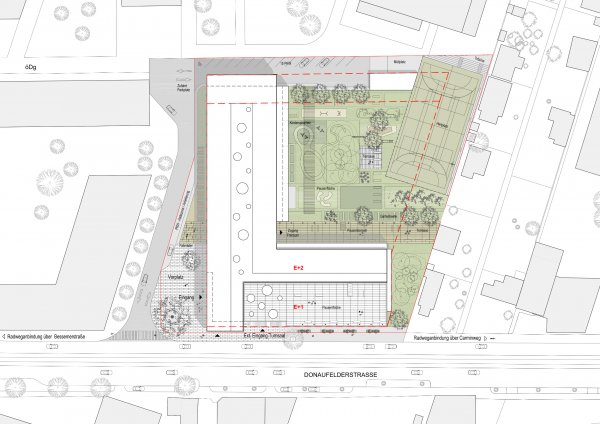 Das Gebäude bildet mit seiner kompakten L-Form, die einerseits mit dem vorgelagerten Turnsaal entlang der Donaufelderstrasse situiert ist und andererseits mit dem Baukörperteil rechtwinklig von ihr, einen städtebaulichen Bezug zur Bebauung des unmittelbaren Umfelds des Bauplatzes.