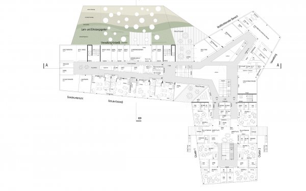 Gliederung und Fassung des Freiraumes durch die Positionierung des neuen Baukörpers. Schaffung einer neuen Gartensituation mit ideal nutzbarem, dem Kindergarten und der Schule für Kinder mit besonderen motorischen Bedürfnissen direkt zugeordnetem Freiraum.