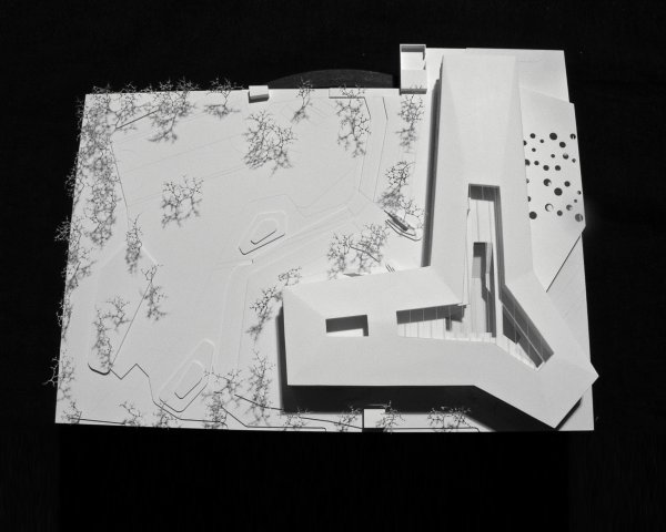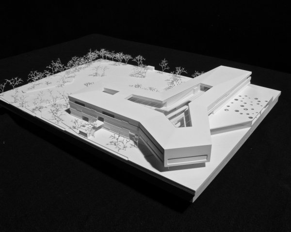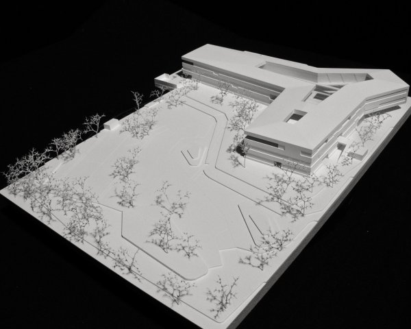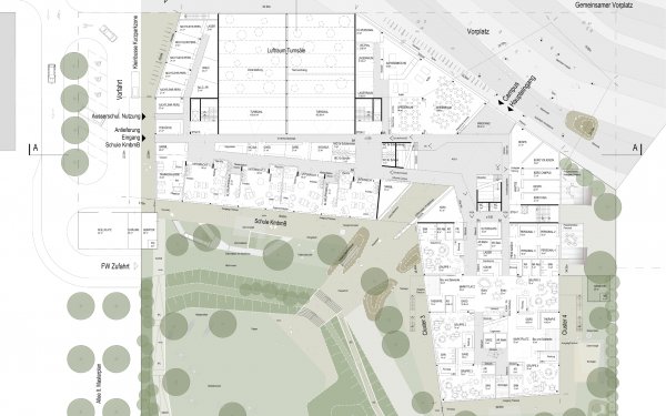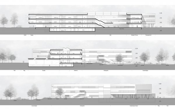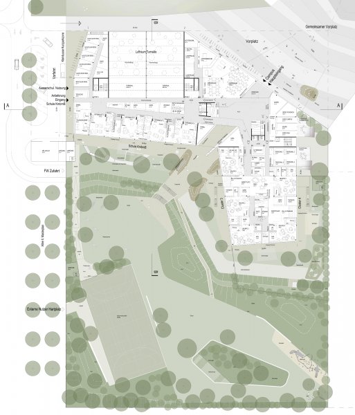 Eigenständige, solitäre Anordnung des dreigeschossigen, kompakten Baukörpers mit Anbindungen zum Park sowie zum geplanten 2. Schulneubau über einen gemeinsamen Vorplatz.