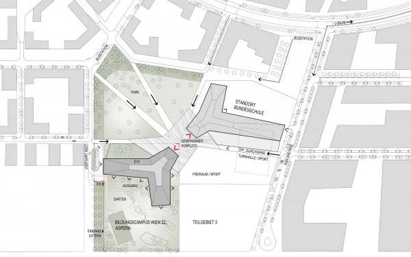 Die Ausrichtung des Grundstücks sowie die Bestandssituation in Bezug auf den Masterplan Seestadt Aspern ergeben die Positionierung und Gliederung der Baumassen am Schulbauplatz.