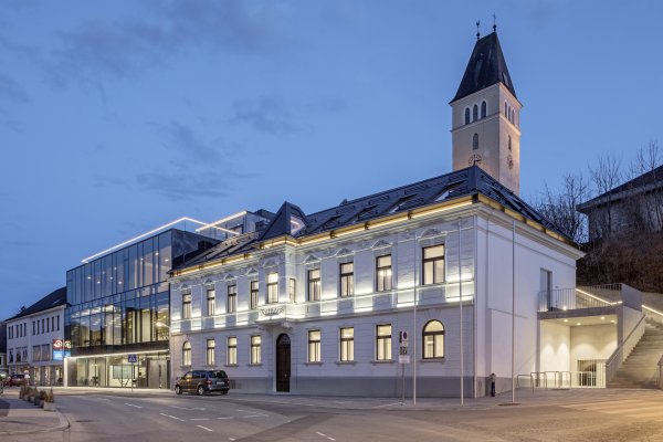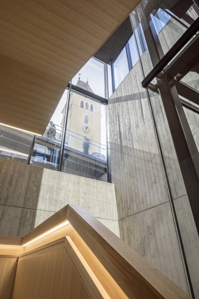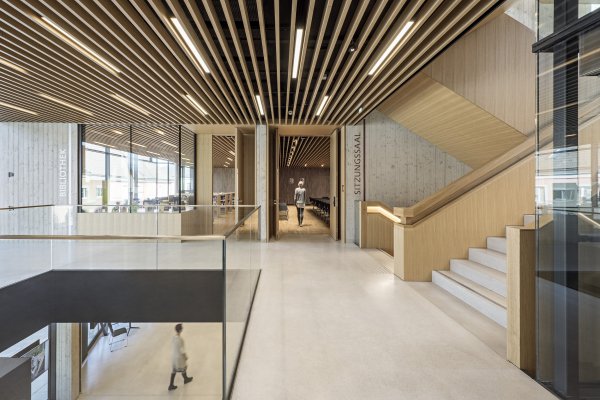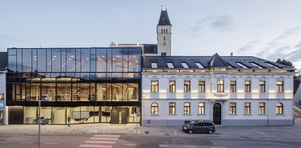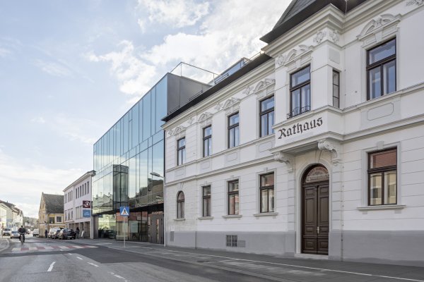 Der Zubau verfügt über einen neuen, großzügigen Zugang. Das Foyer, welches als Drehscheibe und Verteiler für den Bestand und den Neubau dienen soll, verfügt über Nebenräume und entsprechende Wartezonen für Besucher und Parteien, wie z.B. für das Bauamt oder die Räumlichkeiten des Bürgermeisters. Über die neue Stiege und den neuen Aufzug gelangt man barrierefrei in jedes Geschoß. Durch die Einschnitte in den Decken und Lufträumen, sowie großzügige Fassadenöffnungen wird der Blick durch das Gebäude und die Umgebung gelenkt. Diese Blickbeziehung unterstreicht die Funktion des neuen, offenen Gebäudes, hinsichtlich seiner Funktion als Treffpunkt der Bürger, Informationsplattform, Ort für Austausch und vielfältige Veranstaltungen.