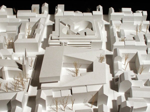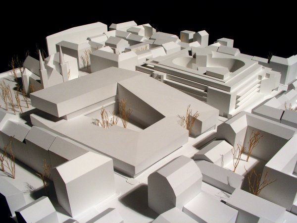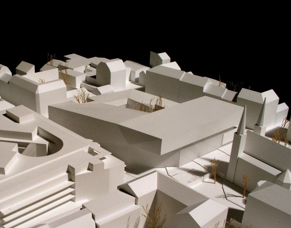 Das Gebäude bildet mit seiner kompakten Form einen städtebaulichen Bezug zur dichten Bebauung des unmittelbaren Umfelds des Bauplatzes.