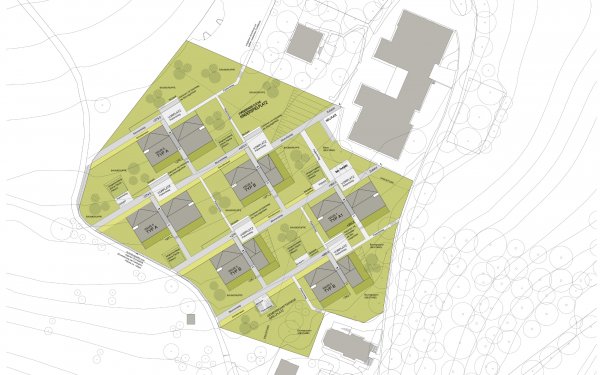 Die Wegeführung verbindet die Einheiten miteinander sowie mit der südostseitig gelegenen Zufahrtsstrasse.
