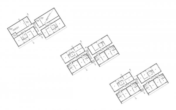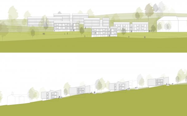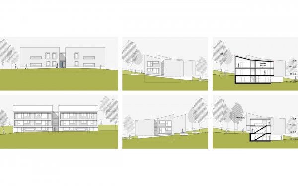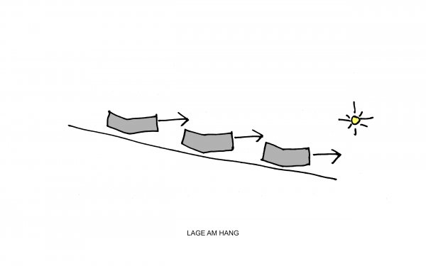 _Anordnung von sechs zweigeschossigen, teilweise in den Hang eingefügten, kompakten und gegliederten Baukörpern.