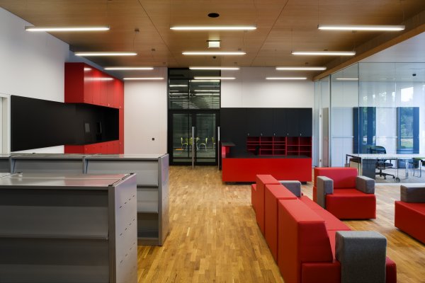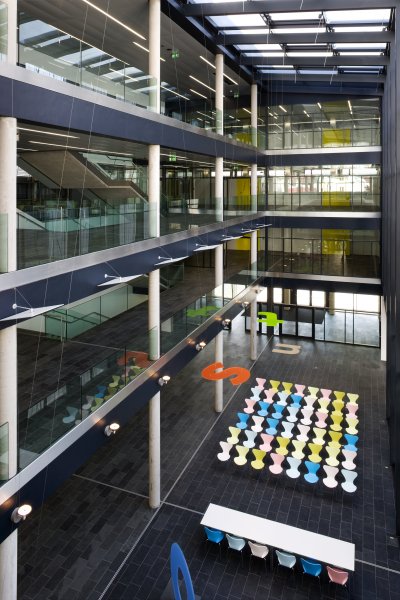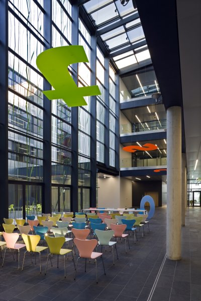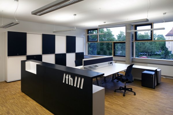 Sämtliche Räume sind um eine zentrale Halle, die von dem begrünten Patio mit einer nordorientierten Glasfassade getrennt ist, organisiert. Die Raumordnung ist in den Obergeschossen nahezu ident und unterscheidet sich nur leicht durch die Trennung von Geschäftsführung und Studiengangsleitung sowie durch den Laborbereich im 3.OG.