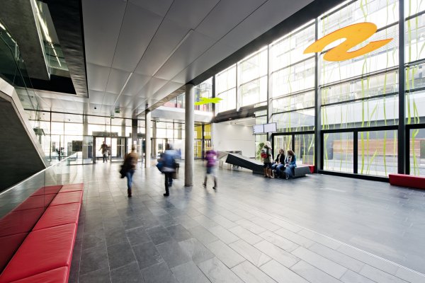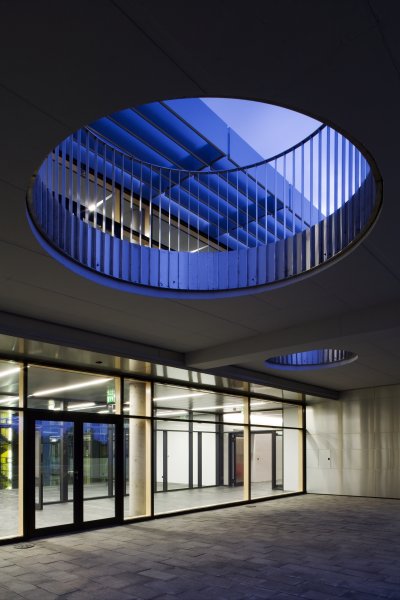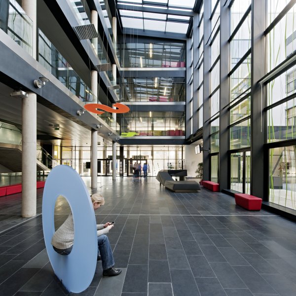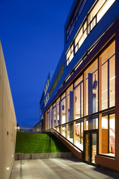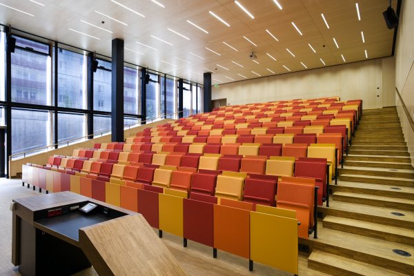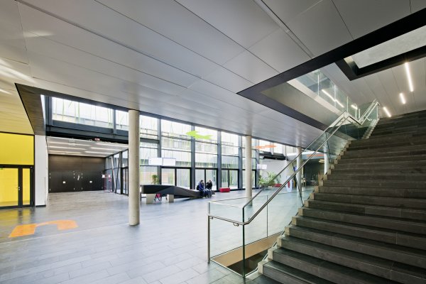 Über einen gedeckten Vorplatz an der westlichen Seite gelangt man in das zentral gelegene Foyer, das als eine Drehscheibe und als Verteiler für die verschiedenen Funktionen dient und im EG einen Festsaal für ca. 500 Personen, 5 Hörsäle für 700 Personen, eine Mensa und Cafeteria sowie ein begrüntes Patio erschließt.