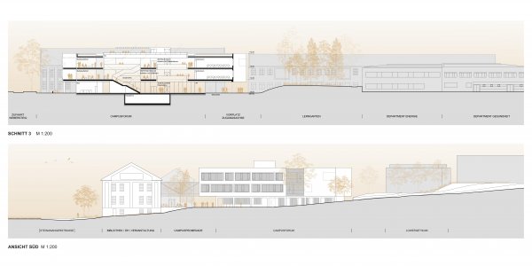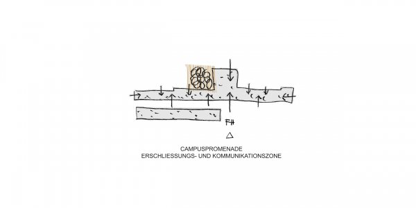 Die Restrukturierung und Revitalisierung mit Schaffung des zentralen neuen Baukörpers sowie der neuen verbindenden Promenade - die FH Zugangsachse - definiert als neues prägnantes städtebauliches Zeichen eine Zone der Erschließung, Begegnung, Kommunikation und des Austausches.