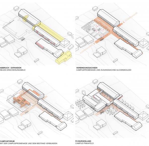 Die Neuordnung des bestehenden FH Campus umfasst den Abbruch von 2 Einheiten, die Reaktivierung und Sanierung von 2 nicht genutzten Strukturen und Umstrukturierung von Teilbestand. Um die Anforderungen für die Zukunft abzudecken ebenfalls die Errichtung eines neuen, nachhaltigen und ökologisch verträglichen (CO2 neutral) Baukörpers, als zentrales Herz. Die neue Drehscheibe soll den Campus als Ganzes verbinden und die gesamte Anlage in seinem Charakter und in seiner Unverwechselbarkeit stärken.