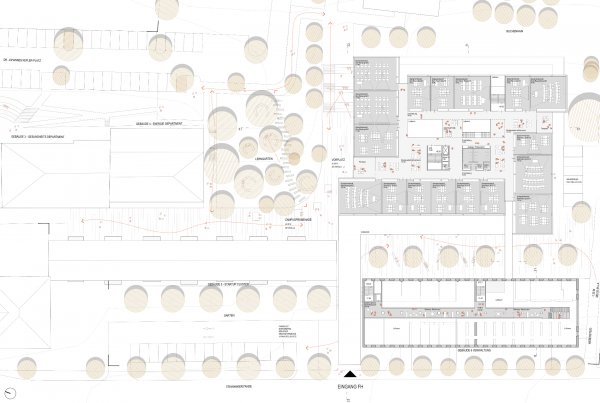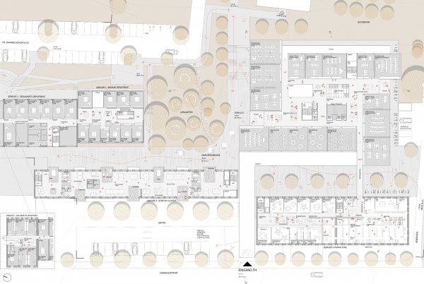 Der konzeptuelle Ansatz betrachtet das Areal in seiner Gesamtheit. Die Formulierung der Zugänge, insbesondere der neuen Promenade und öffentlichen Plätze definiert eine einzigartige Campusstruktur inmitten von hochwertigen Grünräumen und einer vielschichtigen städtebaulichen Einbindung unter Berücksichtigung einer optimalen und wirtschaftlichen Umsetzung.