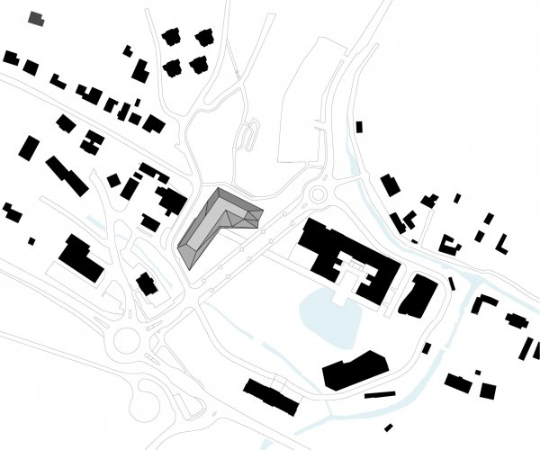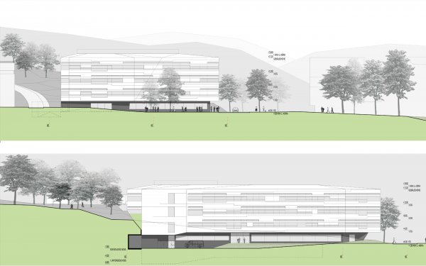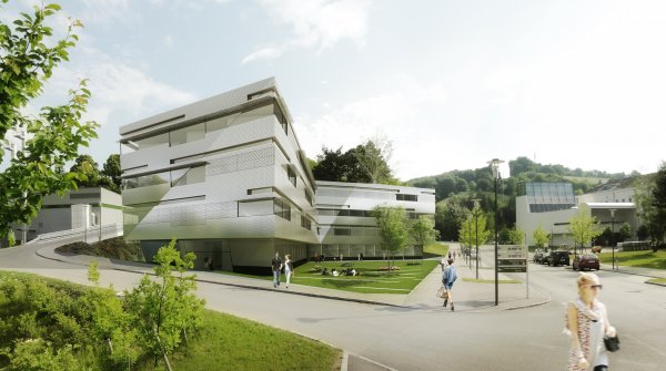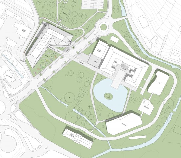 Das Konzept des LAB 3 Gebäudes basiert auf dem Masterplan des neuen Campusgebietes, der neuen, geplanten Parkanlage vor dem Zentralgebäude, auf der bestehenden Bebauung des IST Austria Ensambles und topographisch besonderer Landschaft.