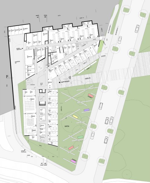 Schaffung des baulichen Abschlusses des Zugangbereiches des ISTA Areals mit einer großen Freifläche als Vorplatz und Garten im Südenosten des Grundstückes