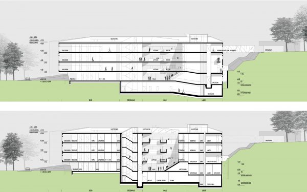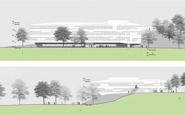 Anordnung eines viergeschossigen, teilweise in den Hang eingefügten, kompakten und gegliederten Baukörpers Richtung Nordwest.