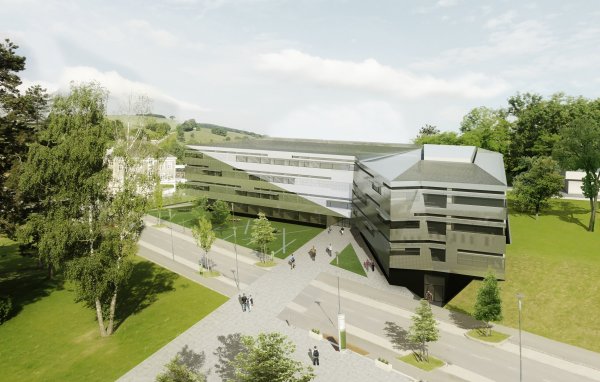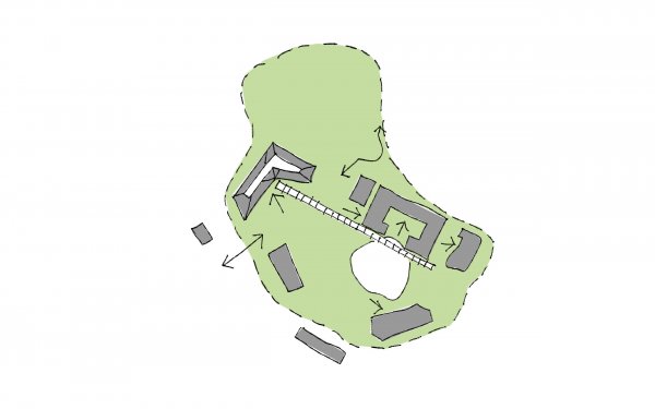 Zugänge sind vom Parkplatz und Restaurant, mit Rad- und Fußwegen bzw. vom Zentralgebäude über den großzügigen Vorplatz, der als Veranstaltungsort und Treffpunkt genutzt werden kann, geplant. Die innere Organisation der Forschungs- u-. Lehreinheiten ist übersichtlich und über kurze Wege sowie über die Halle als vertikales Foyer, barrierefrei gegeben.