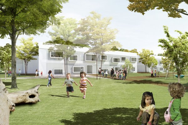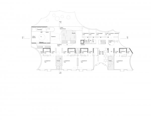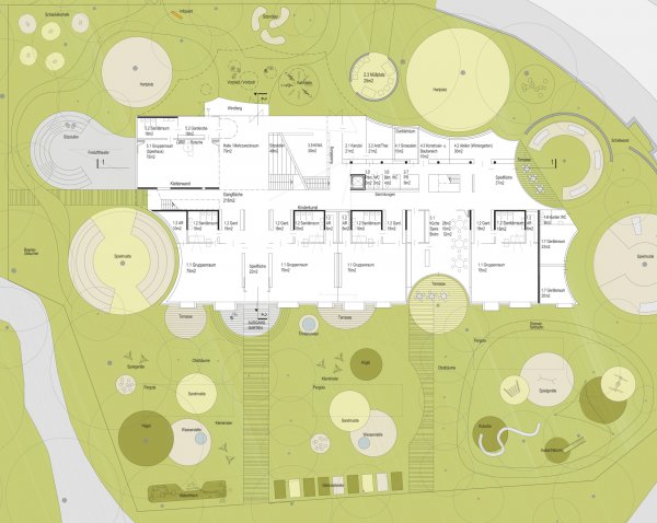 Die innere Organisation der einzelnen Bereiche beider Einrichtungen ist übersichtlich und über kurze Wege miteinander verbunden. Ein fließender, transparenter Übergang zwischen den Innen- und Außenräumen sowie deren Zwischenräumen ermöglicht die im Kindergartenbetrieb notwendige Vielfalt der Nutzung.