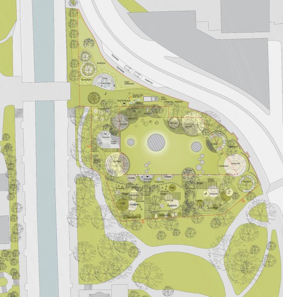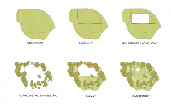 Ein, auf der vorhandenen Grünraumstruktur der Umgebung, in Anbetracht der Erhaltung des Baumbestandes und Schaffung eines hohen architektonischen Anspruches, basierendes Konzept zeichnet sich als Identitätsstifter der neuen Bebauung mit größtmöglichem Freiraum.