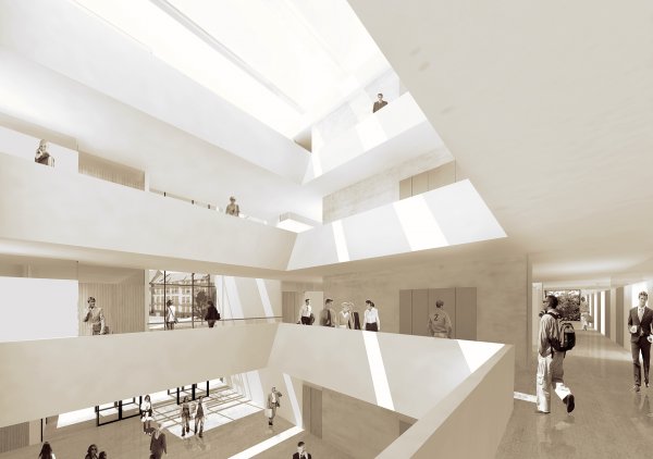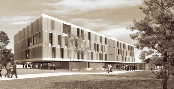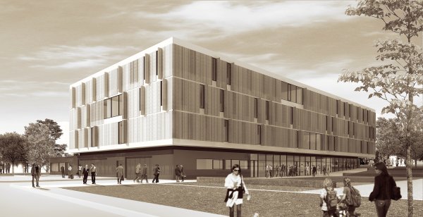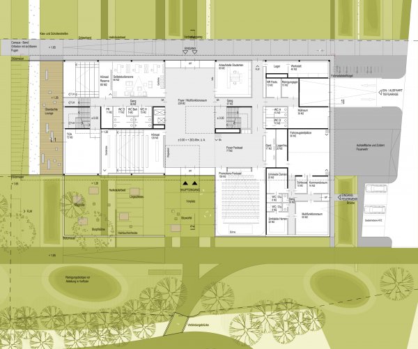Die Umgebung bekommt ein prägnantes, städtebauliches Zeichen Eigenständige, solitäre Anordnung des viergeschossigen, kompakten Baukörpers mit direkten Anbindungen zu den bestehenden Campusfunktionen sowie Schaffung einer Erschließungszone die eine unmittelbare Verbindung zu künftigen Erweiterungsbauten ermöglicht. Kompaktes Gebäude mit optimaler Umsetzung der Räumlichkeiten lt. Raum- und Funktionsprogramm. Gliederung und Fassung des Freiraumes durch die Positionierung des neuen Baukörpers. Schaffung von neuen Freiraumsituationen mit ideal nutzbarem, dem Hörsaal und Festsaal direkt zugeordnetem Vorplatzbereich im Erdgeschoß. Zusätzliches Außenraumangebot durch großzügige den Besprechungsräumen und Aufenthaltsräumen zugeordnete Patios im Bürogeschoß. Für alle Seminar- Labor- und Bürozonen wird auf Grund der Positionierung des Baukörpers eine optimale Besonnung erreicht. Die Erschließung der Feuerwache erfolgt über die südlich gelegene Zufahrtsstraße die ebenfalls an die Tiefgarage anbindet.