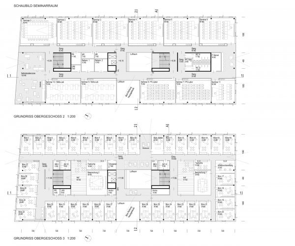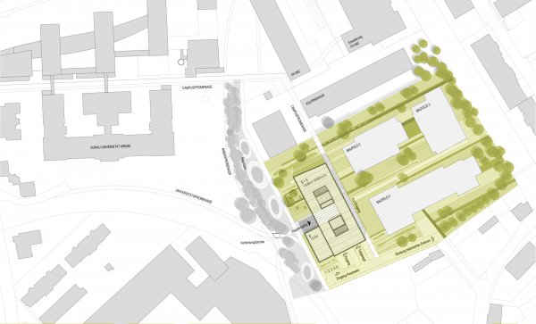 Die Ausrichtung des Grundstücks sowie die Bestandssituation des Campusgeländes sowie die zukünftige Erweiterbarkeit des Ensembles ergeben die Positionierung und Gliederung der Baumassen am Standort.
