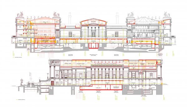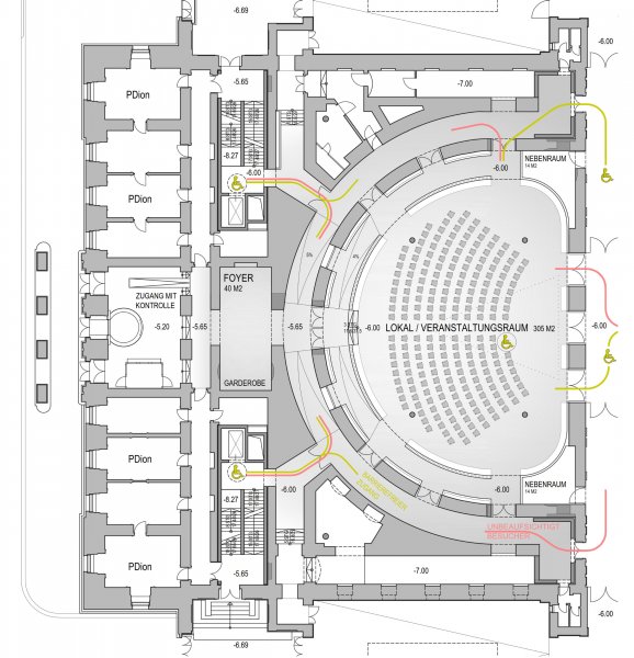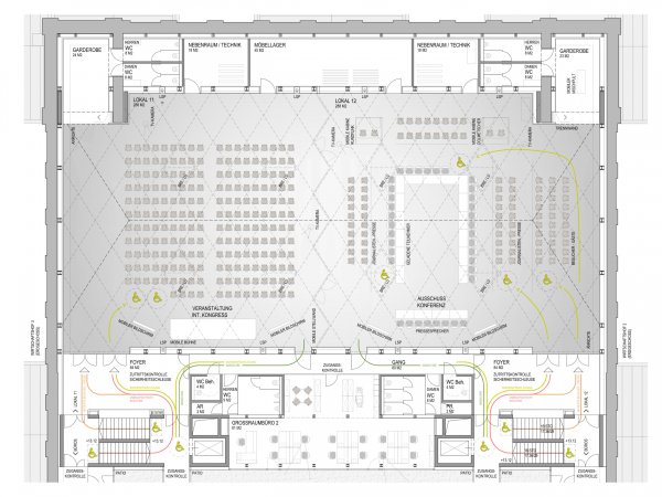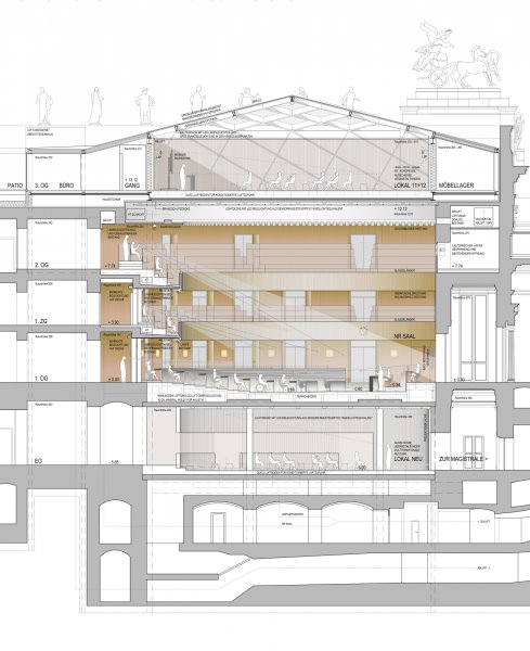 Diese Interventionen beziehen sich einerseits auf notwendige infrastrukturelle Maßnahmen, wie zusätzliche (oder zu sanierende) Stiegenhäuser zur erforderlichen Entfluchtung, Nutzung bisher unbenutzter räumlicher Kapazitäten wie „Amphitheater“, „Magistrale“, Bücherspeicher und BV-Saal sowie die effizienzsteigernden Maßnahmen im Dachgeschoß (über NR-Saal und zentraler Achse über Säulenhalle) für neue Lokale und Restaurant / Cafeteria) Ergänzt werden diese Stiegen durch neue Stiegen in den Räumen neben BRSaal und Sprechzimmer sowie Lokal VI und neben Hof 1 und 8.
