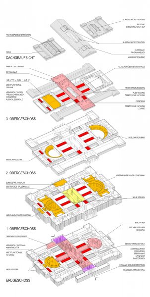 Der Gesamtlösungsansatz für Sanierung und Nutzung des Parlamentsgebäudes, geteilt in Grundsanierung und effizienzsteigenden Maßnahmen, basiert auf dem Leitgedanken einer Sanierung des Bestandes mit klar gesetzten, selbstbewußten und zeitgemäßen Sanierungsmaßnahmen und Ergänzungen.