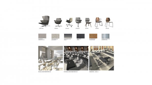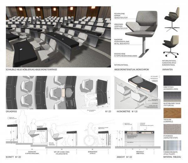 Grundsätzlich basiert das Konzept auf Wahrung der gestalterischen Gedanken, einerseits des in der Architektur des Historismus erbauten Gebäudes von Theophil Hansen und andererseits auf dem Umbau des Nationalratssaales, unter den Einflüssen der Nachkriegsmoderne von Architekten Fellerer und Wöhrle.