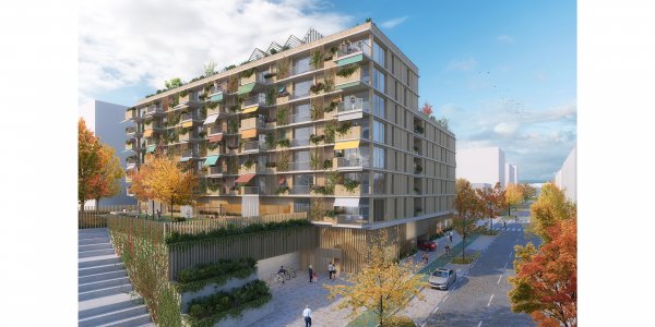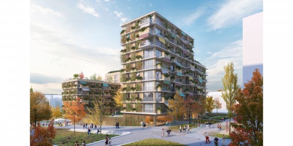 Die Geländekante wird mit der Scholle aus Gewerbeflächen und Wohnserviceräumen als aktive und attraktive Sockelzone ausformuliert.