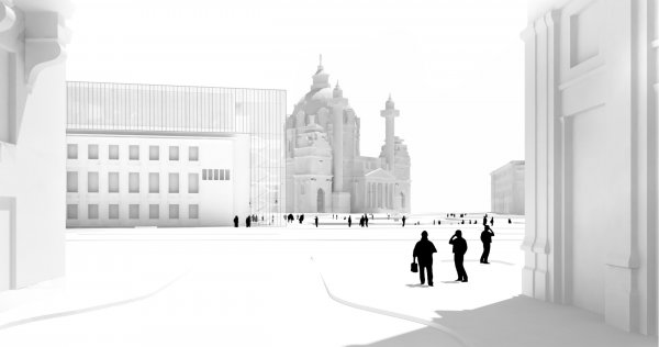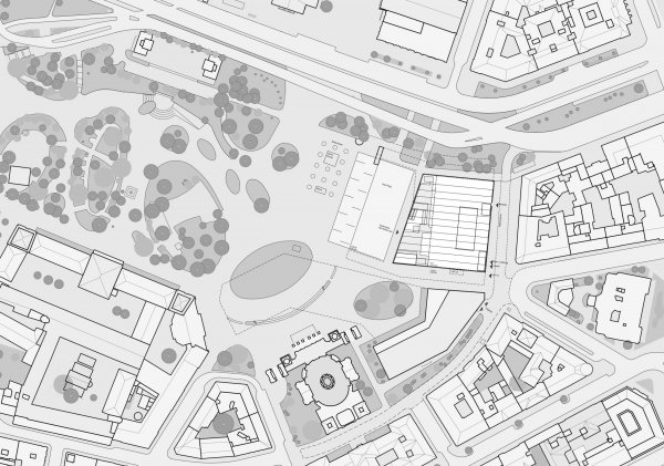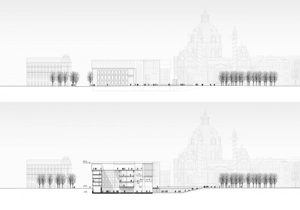 Die neue Front folgt der Logik der Achsen und Blickbeziehungen der umliegenden Blockrandbebauung. Der Grundgedanke greift die städtebauliche Idee auf, die Bildung des Platzes als einen wesentlichen Teil des städtischen Drehbuches zu definieren. Das neue Museum tritt nicht in Konkurrenz mit der Karlskirche und durch die angepasste Volumetrie fügt es sich in die Dramaturgie des Stadtbildes ein.