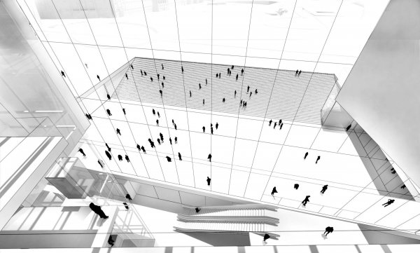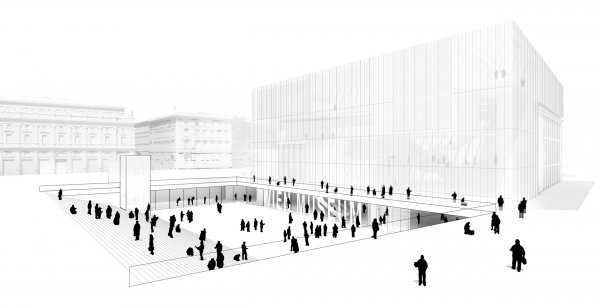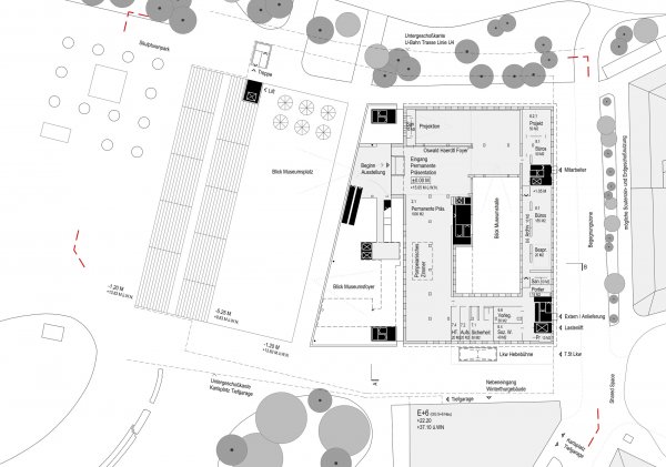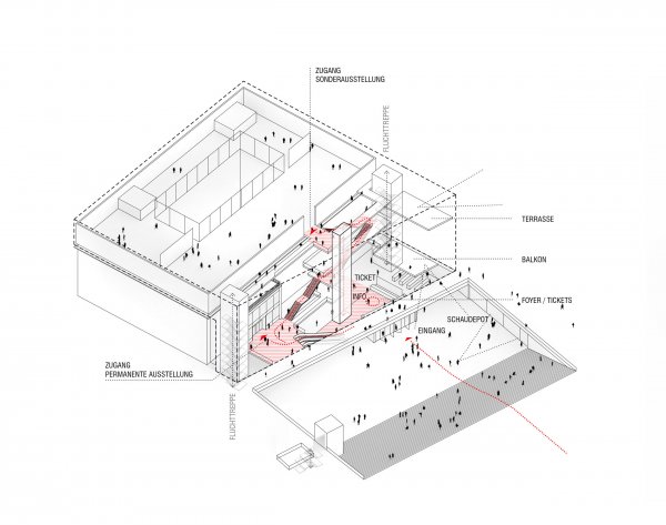 Ein öffentlicher Museumsplatz artikuliert sich als ein offener, demokratischer Raum, der gleichzeitig einen Vorhof zum Museum, wie auch ein intimeres Open-Air „Wohnzimmer“ bildet. Diese neue Ebene des sozialen und kulturellen Austausches, die ein Kaffee, den Museumseingang und ein Schaudepot beinhaltet, bietet Platz für verschiedenen Veranstaltungen (Kunstvermittlung, Kino unter den Sternen, Konzerte, Märkte, Feste, Tag der offenen Türen, etc…)